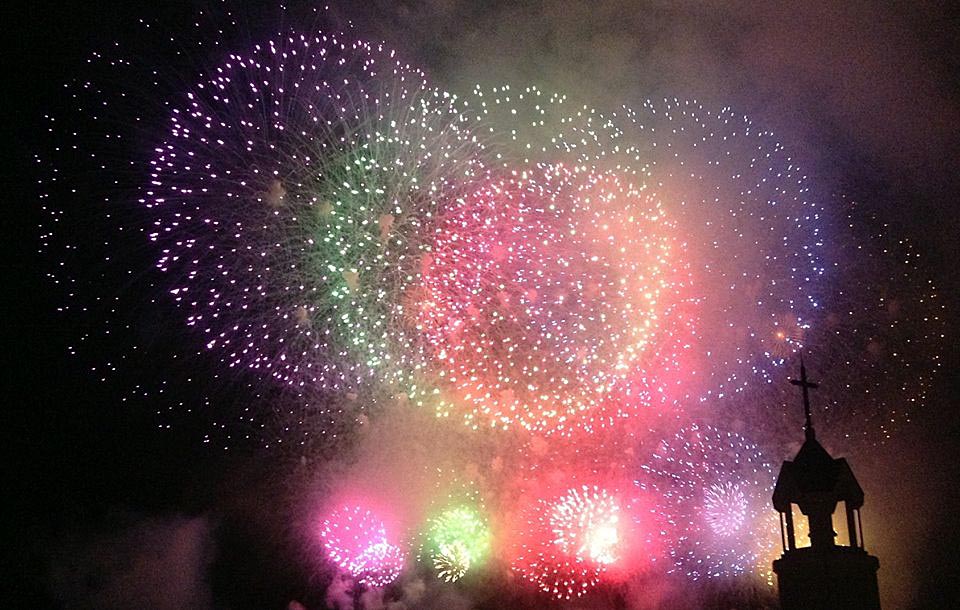 花火の始まる前、TwitterやFacebookの使い方が まだよくわからない はるみさん、同行の渡辺さんに一所懸命に訊いてたけど、今はどうかな?目の前に結婚式場のチャペルがある屋上での鑑賞です。